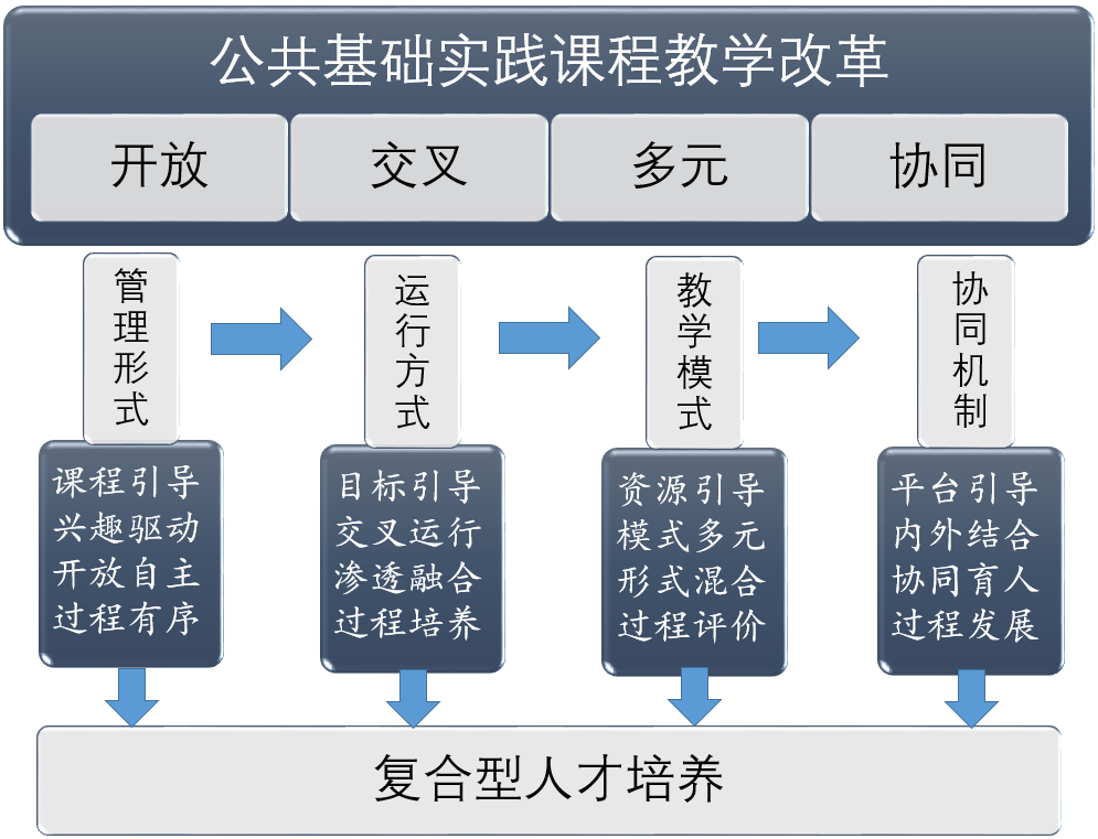 目前,物理实验中心分布于将军路校区和天目湖校区,实验室建筑面积近8000平方米,资产总额约3000余万元。各实验室面向全校各专业学生教授物理实验课程20多门,开设实验项目数量100多项,年开放人次数近6万。中心现有教师17人,其中高级职称5人,中级职称12人。在互联网+、新工科建设引领的新一轮科技革命和产业变革背景下,物理实验中心践行以“开放管理、交叉培养、多元融合、协同育人”为导向的教学理念和育人模式(图2),注重教学管理与信息技术的深度融合,育人模式与形势发展的高度结合,为动漫疯 复合型人才培养打下了坚实的基础。