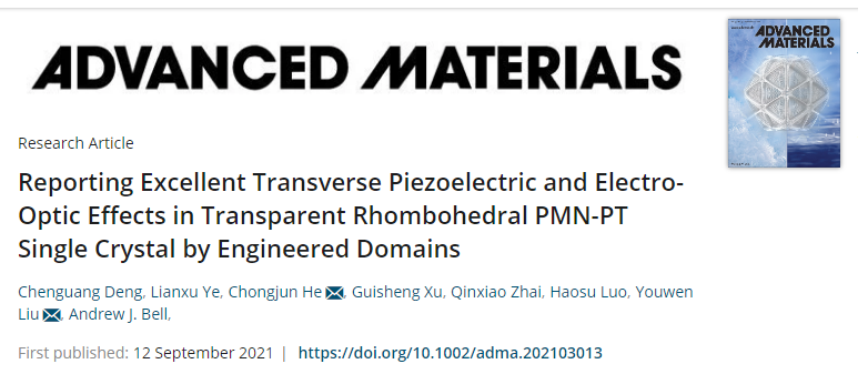 近日,国际顶级期刊《Advanced Materials》(先进材料,IF:30.849)在线发表动漫疯 理学院团队的研究成果“通过铁电畴工程实现具有优异横向压电和电光效应的透明PMN-PT单晶”,该论文第一作者为理学院博士生邓晨光,理学院刘友文教授和航天学院赫崇君副教授为论文通讯作者。