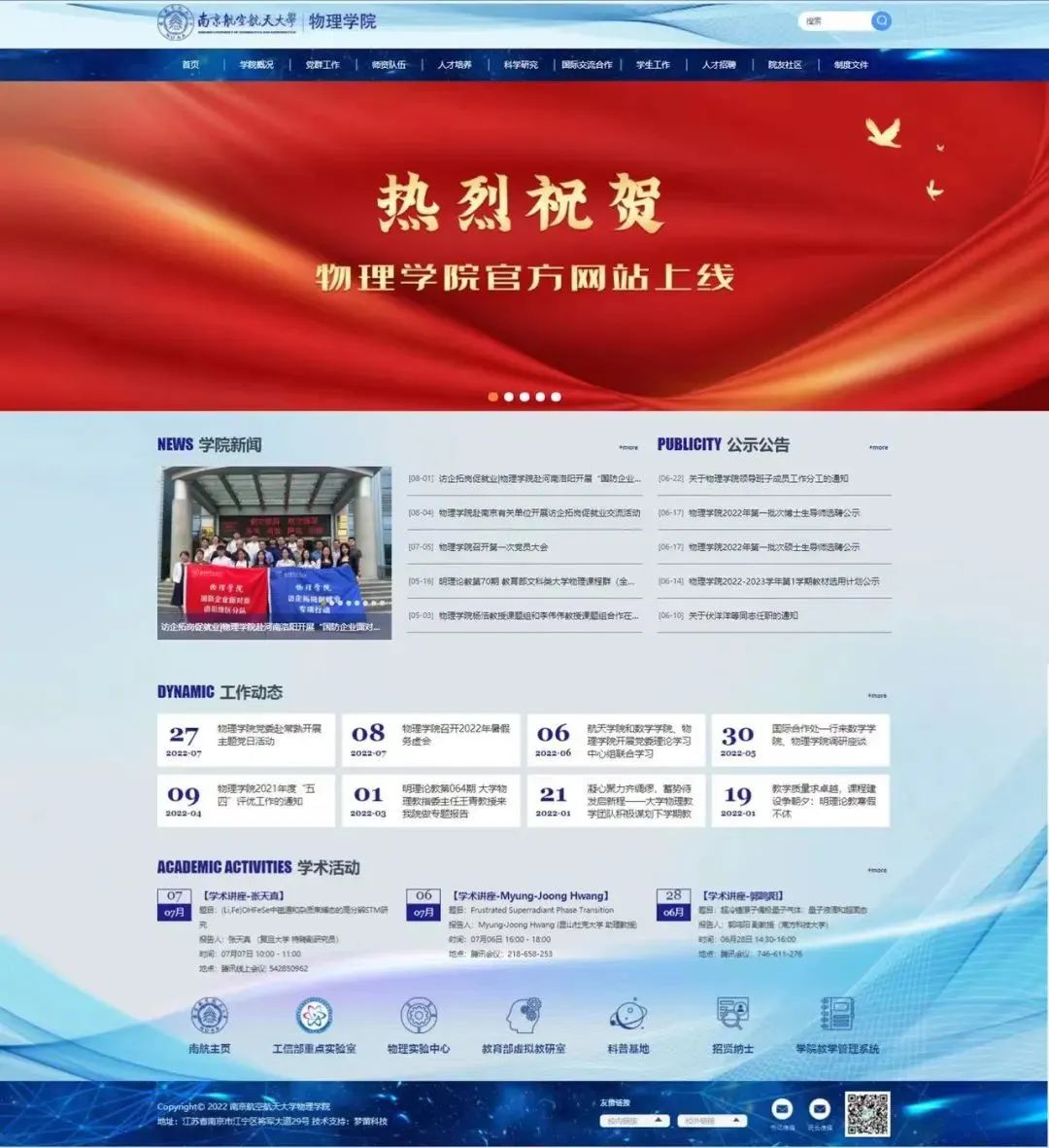 新学院,新气象。在前期充分调研和广泛征求意见的基础上,学院于6月下旬启动了官方网站的建设工作,经过几轮设计修改、编程测试及内容更新,动漫疯 官方网站即日起正式运行。动漫疯 官方网站主色调采用南航蓝,融入物理与空天特色。网站包含动漫疯概况 、党群工作、师资队伍、人才培养、科学研究、国际交流合作、学生工作、人才招聘、院友社区和制度文件等十个栏目,全面细致地展示了动漫疯 的全新的风貌。