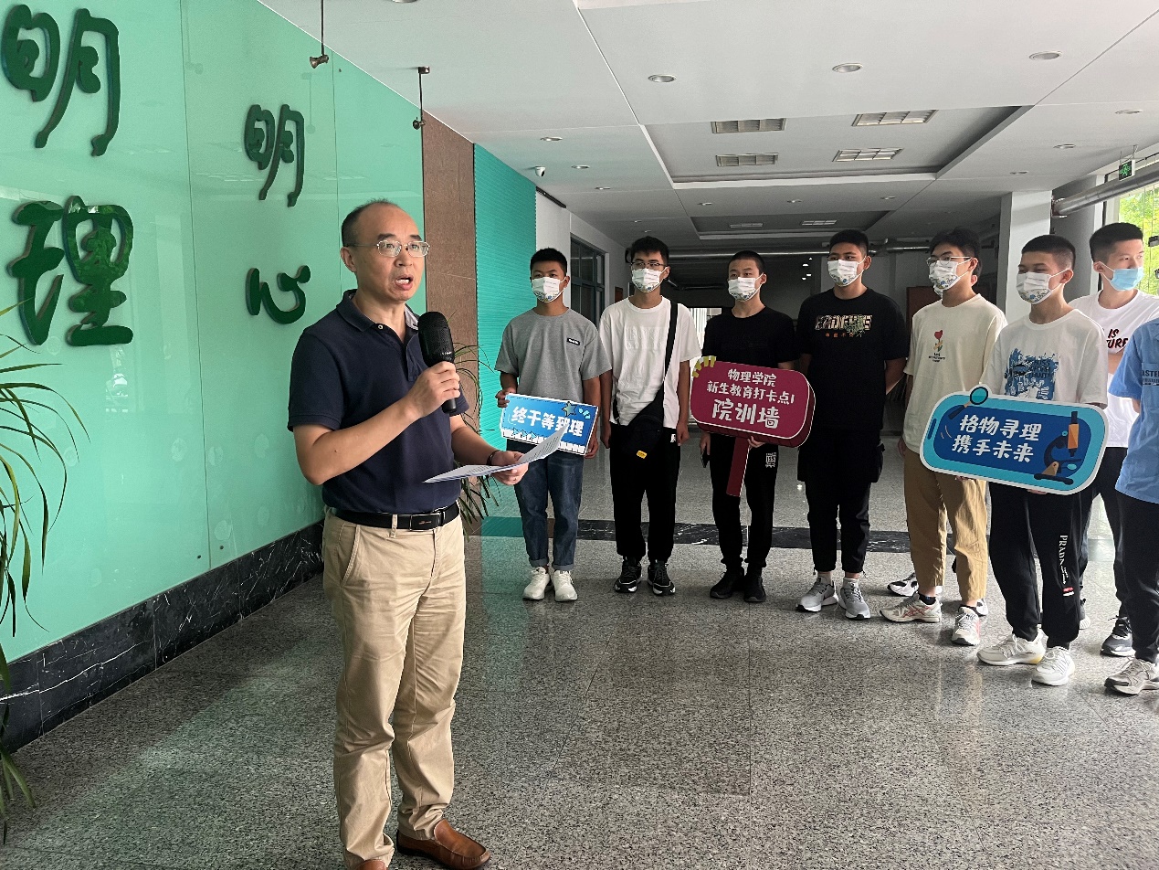 开放日的首个打卡点是院训墙,学院院长刘友文教授向新生介绍了学院院徽和院训的内涵。刘院长从院徽中的“格”字讲起,介绍了学科从上世纪“格物学”到本世纪“物理学”的历史沿革脉络以及未来发展前景,同时以院徽的南航蓝底色引出了南航物理学科的国防背景。刘院长在讲解院训“明德、明理、明心”的来历时,重点介绍了院训所蕴含的“培根铸魂、启智润心”之意。院训墙一侧是学院名师海报,刘院长一一进行了介绍并鼓励新生多到学院楼与老师们进行交流。