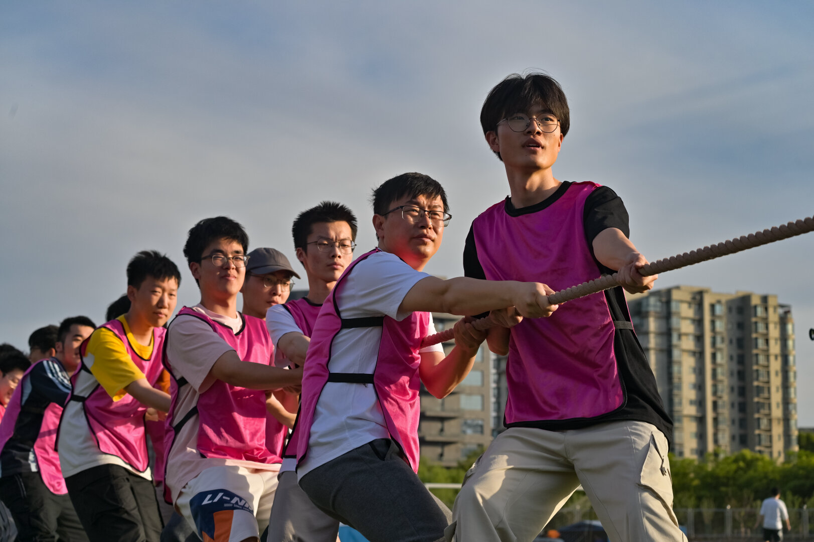 “团结一心 力拔山河”项目将全场的气氛推向了高潮,场上助威加油的呐喊声震耳欲聋。拔河最是要求大家“劲往一处使”,粗长的绳子不仅承载着双方队员的力量,更体现了场上场下老师与同学们的信任与配合。在短促齐整的口令中,师生们坚定目光,全力以赴,竭尽所能为团队的荣耀而战。