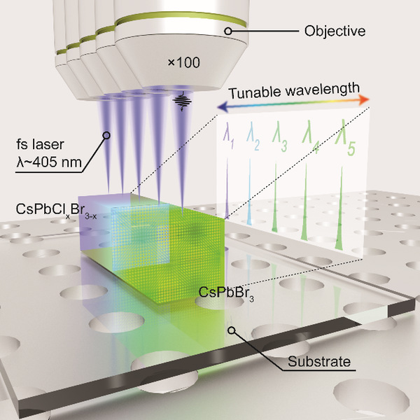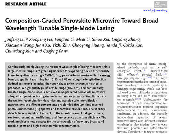 动漫疯 光电功能材料器件与物理研究团队卢俊峰副研究员与东南大学徐春祥教授、北京航空航天大学潘曹峰教授合作,利用气相阴离子交换方法制备了卤素组分沿长轴方向呈梯度渐变的CsPbClxBr3-x微米线,为构建宽范围、波长连续可调谐新型激光器同时提供了必要的光学增益介质和谐振腔。相关成果以“Composition-Graded Perovskite Microwire Toward Broad Wavelength Tunable Single-Mode Lasing”为题在线发表在光学顶级期刊《Laser&Photonics Reviews》上。卢俊峰副研究员为第一作者和通讯作者,硕士研究生何小朋为该工作共同第一作者,东南大学徐春祥教授、北京航空航天大学潘曹峰教授为共同通讯作者。