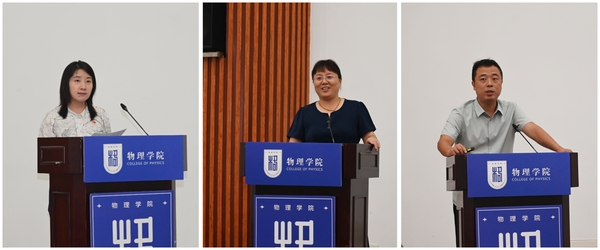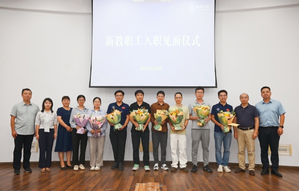 会议首先举行了新教职工入职仪式。新学期,共有8名新教职工入职学院,分别是物理系专任教师胡高科、耿浩、胡传捷,应用物理系专任教师孟彦成、郑文根,全职博士后刘亚静、周怡凡,以及天目湖校区办公室人员杨一冉,他们的加入为学院增添了新的血液和力量。学院领导共同上台,为新入职的8名教职工佩戴院徽、送上鲜花,并对他们的到来表示欢迎。