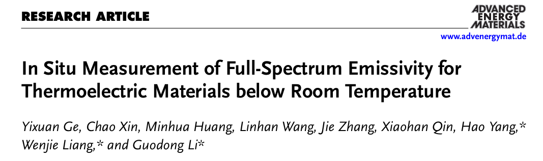 近日,动漫疯 杨浩教授团队与中国科学院物理研究所梁文杰研究员和李国栋副研究员团队合作,发展了一种可对固体材料的本征发射率进行精密测量的方法。相关研究成果以《In Situ Measurement of Full-Spectrum Emissivity for Thermoelectric Materials below Room Temperature》为题发表在《Advanced Energy Materials》上。