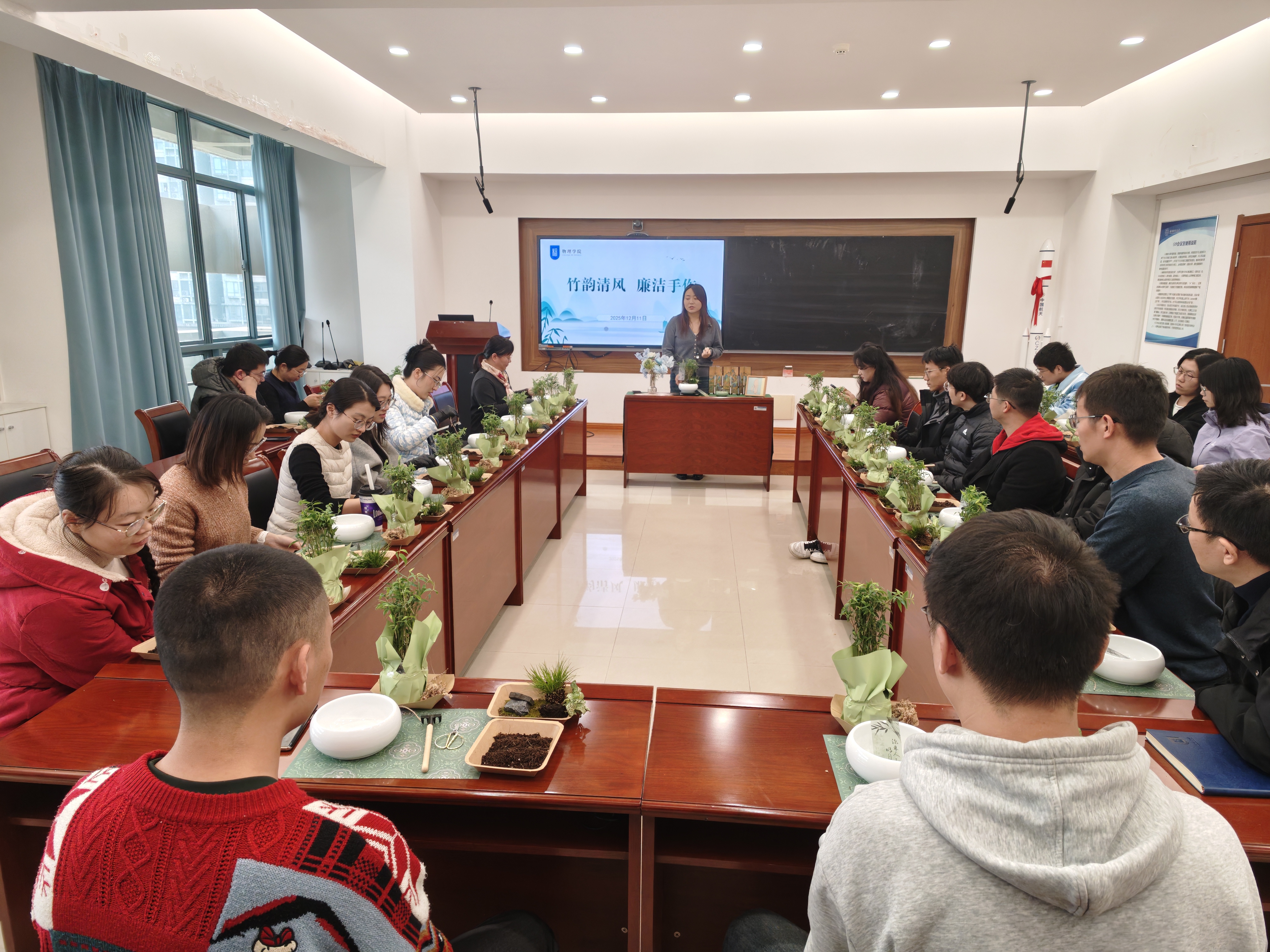 党课结束后,进入“竹韵清风・廉心手作”实践环节。学院创新采用中式绿植手作形式,精心准备青龙石、鲜竹枝、苔藓等造景材料,将廉洁教育与传统美学有机结合。参与活动的教职工专注投入创作,从材料选择到景观布局,深度挖掘竹子“外直中空、清影坚韧”的廉洁文化内涵,完成了兼具艺术价值与教育意义的清廉主题绿植盆栽作品。实践环节通过沉浸式体验,让廉洁理念在实践操作中入脑入心,切实达到了“以手作悟廉道、以绿植润初心”的教育目标。